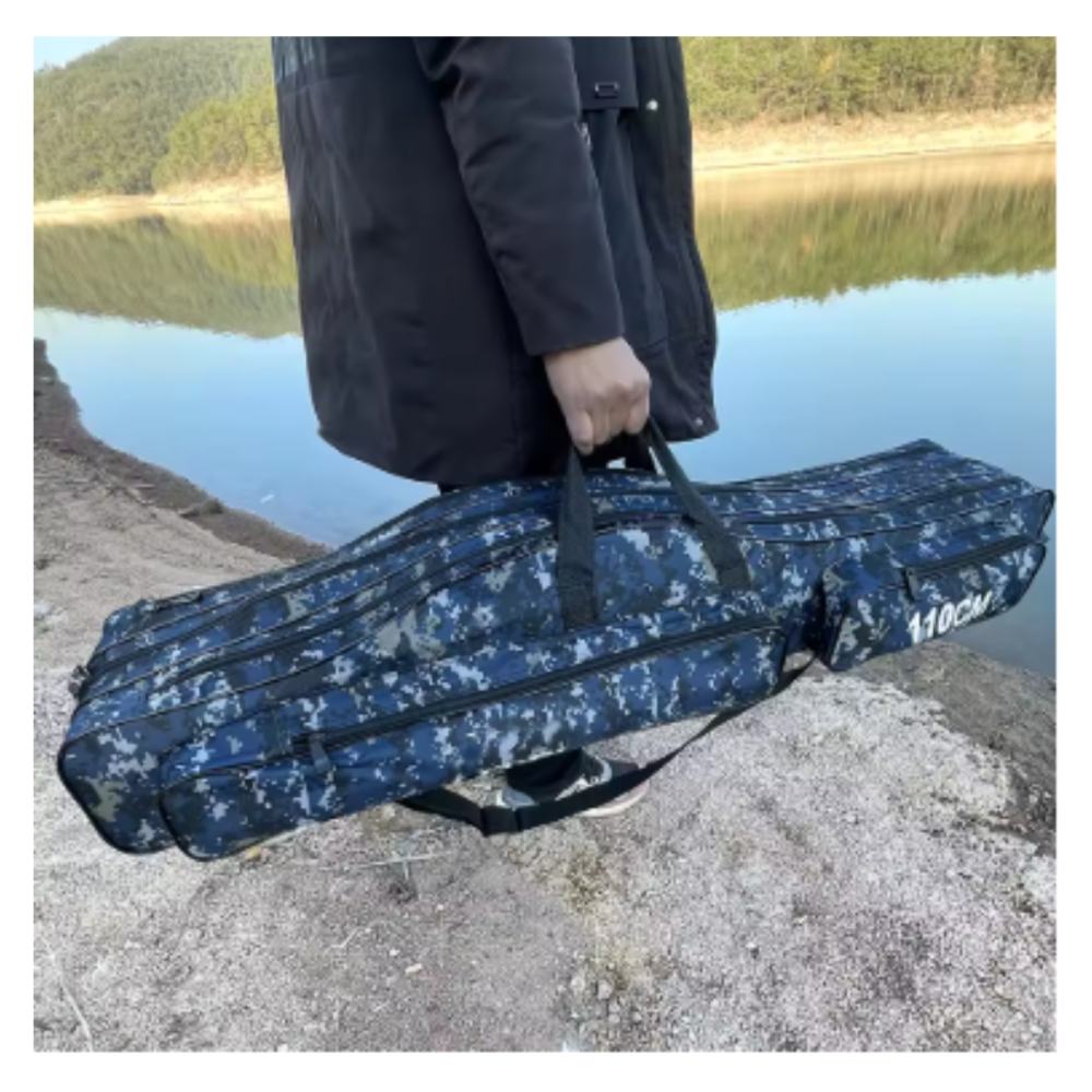 This stylish and practical bag is specially designed to safely and easily store and carry your fishing rods. It features an attractive blue and black camouflage design, giving it a modern look that's suitable for outdoor activities.